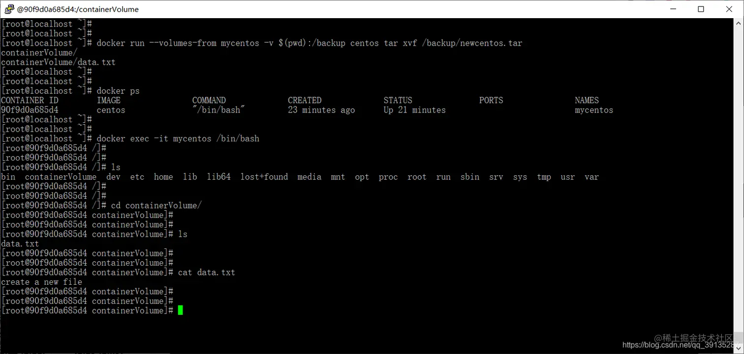 1、删除数据卷容器 mycentos 中的数据卷里的 data.txt 文件,模拟数据的丢失