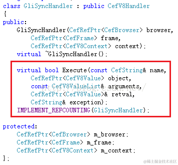 首选需要定义一个处理类,该类需要从CefV8Handler派生。如下图示例:
