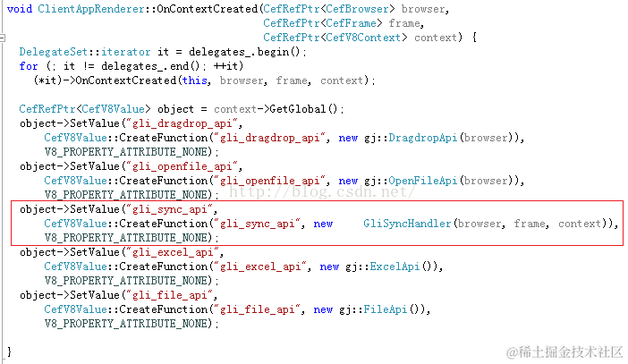 其中构造函数、析构函数、成员变量可根据需求任意定制。唯一需要的是实现图中红框标记的函数和声明。在声明该函数之后,同样需要注册后方可生效。注册的位置在文件“client_app_renderer.cc”的函数“ClientAppRenderer::OnContextCreated”中。如下图: