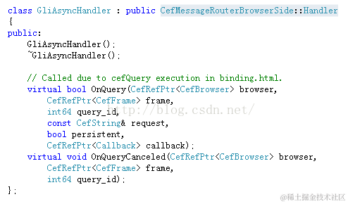 首先需要定义一个用来处理异步调用的类,该类必须从CefMessageRouterBrowserSide::Handler派生。如下图: