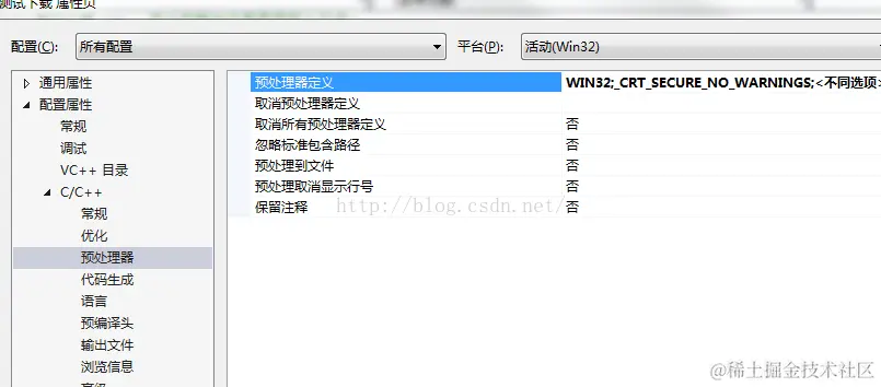 c++关于不安全函数报错的处理 303103757 2022-10-15 105 阅读1分钟 我们经常在用到以前的c语言的函数时,总是 要报错,说这个函数过时或者不安全, 处理方法: 首先,打开项目属性,配置属性,C/C++,预处理器, 在里面添加如下字符串: _CRT_SECURE_NO_WARNINGS