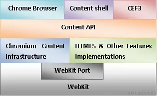 CEF3支持一系列的编程语言和操作系统,并且能很容易地整合到新的或已有的工程中去。它的设计思想就是易用且兼顾性能。其目的是提供一套嵌入式的接口。其主要依赖于公开的Content API来实现的。为了清晰地了解它们之间的的关系,下图描述了WebKit, Content API,Chrome,Content shell和CEF3的层次关系。Chrome浏览器,content shell和CEF3三者都是基于content API开发的,它们只是有不同的实现,服务于不同的应用场景而已。