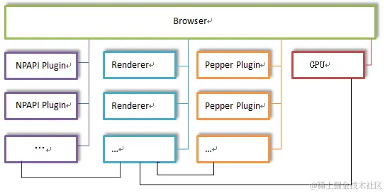 NPAPI插件进程:按需创建,每种类型的插件只会有一个进程,每个插件进程可以被多个Render进程共享;