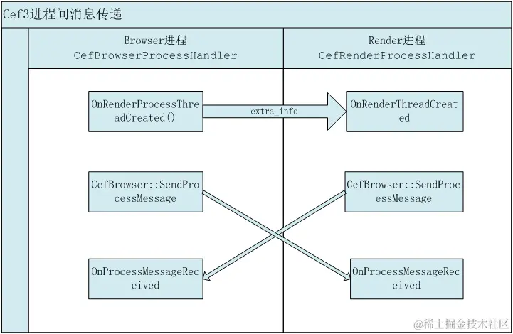进程间传递消息,都要通过GetArgumentList获取和Set*(SetString、SetInt)来设置。所有render进程提供利用相同的消息传递方式:通过browser进程中的CefBrowserProcessHandler::OnRenderProcessThreadCreated()将消息传递给render进程中的CefRenderProcessHandler::OnRenderThreadCreated()。
