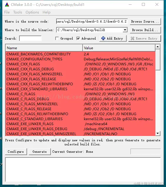 第五步,点击cmake软件中的Generate按钮,接着就是等它编译完成
