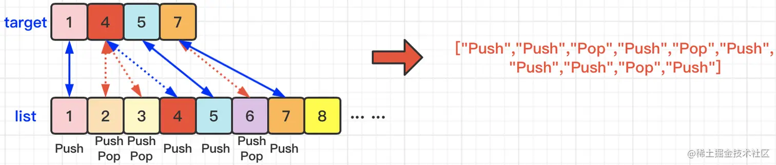 创建用于最终结果返回的集合List<String> result;那么,当target[i]等于num的时候,则向result中插入“Push”字符串;当target[i]不等于num的时候,则向result中插入“Push”和“Pop”字符串;依次类推,当遍历完target数组后,将最终的结果result返回即可。具体操作如下图所示: