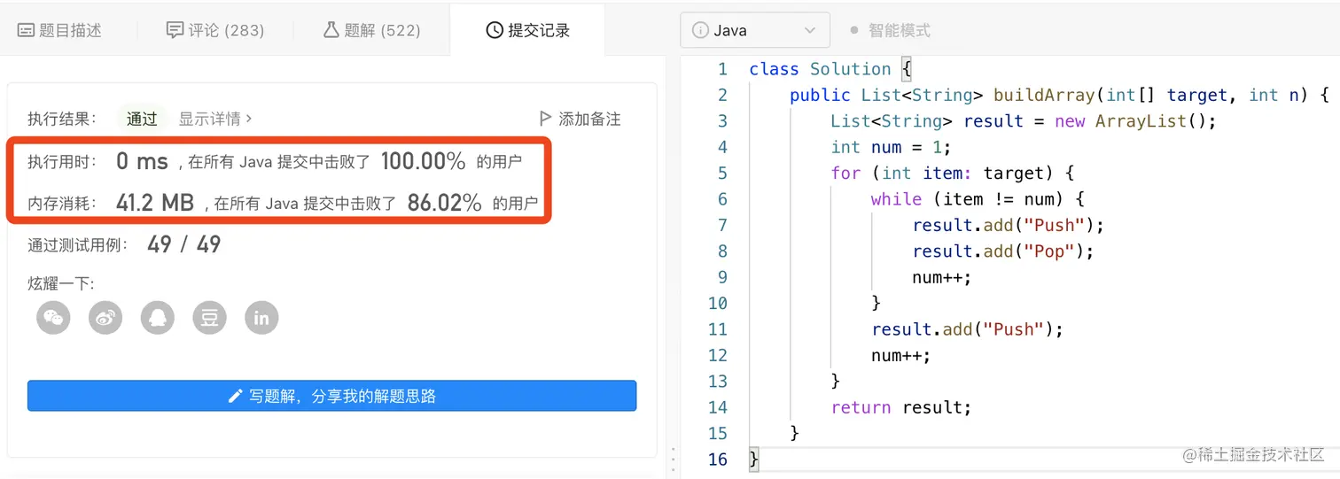 根据题目描述可以知道,list集合是严格递增的,即: list = { 1 , 2 , 3 ..., n },而且target数组也是严格递增的,因为我们最终的结果是要获取拼装成target的“动作”(“Push”/“Pop”)集合,所以,我们只需要遍历targe数组,使其与递增的num进行对比,因为num的初始值为1,每次对比num都执行加1操作,所以在最终遍历之后,它的值就是1,2,3……递增的,可以代表题目中锁描述的集合list。
