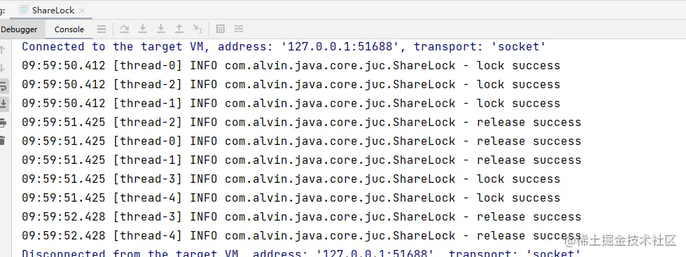 lock success,说明同时只有3个线程共享。 - 只有在释放共享锁以后,其他线程才能获取锁。