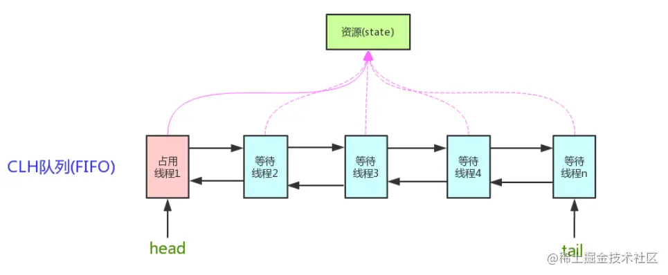 AQS内部维护了一个volatile int state(代表共享资源)和一个FIFO线程等待队列(多线程争用资源被阻塞时会进入此队列)。