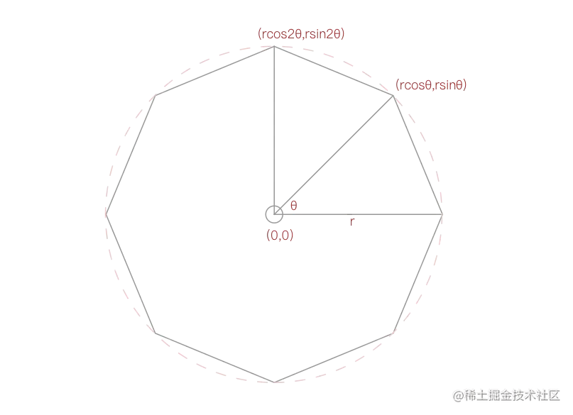以圆心为原点,半径为r,则正多边形的第1个顶点坐标为 (rcosθ, rsinθ),其中 θ 可以看做是 360/多边形边数。第2个顶点坐标为 (rcos2θ, rsin2θ),如下图