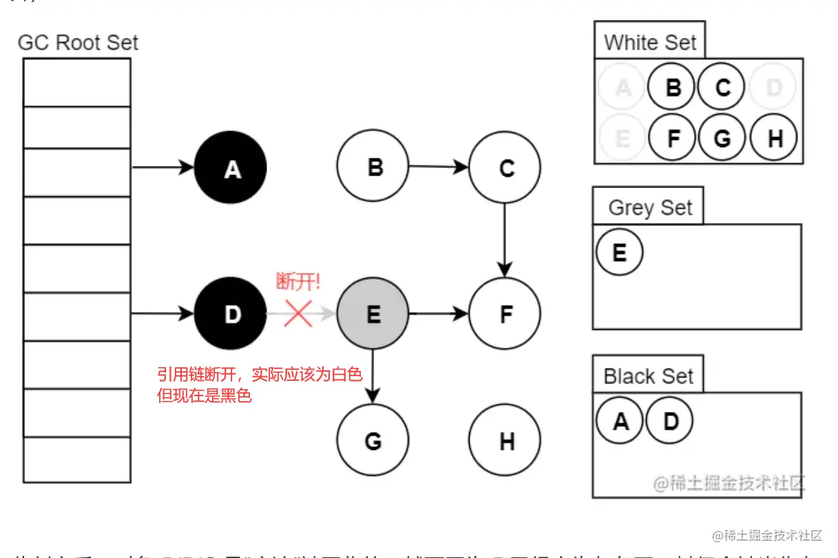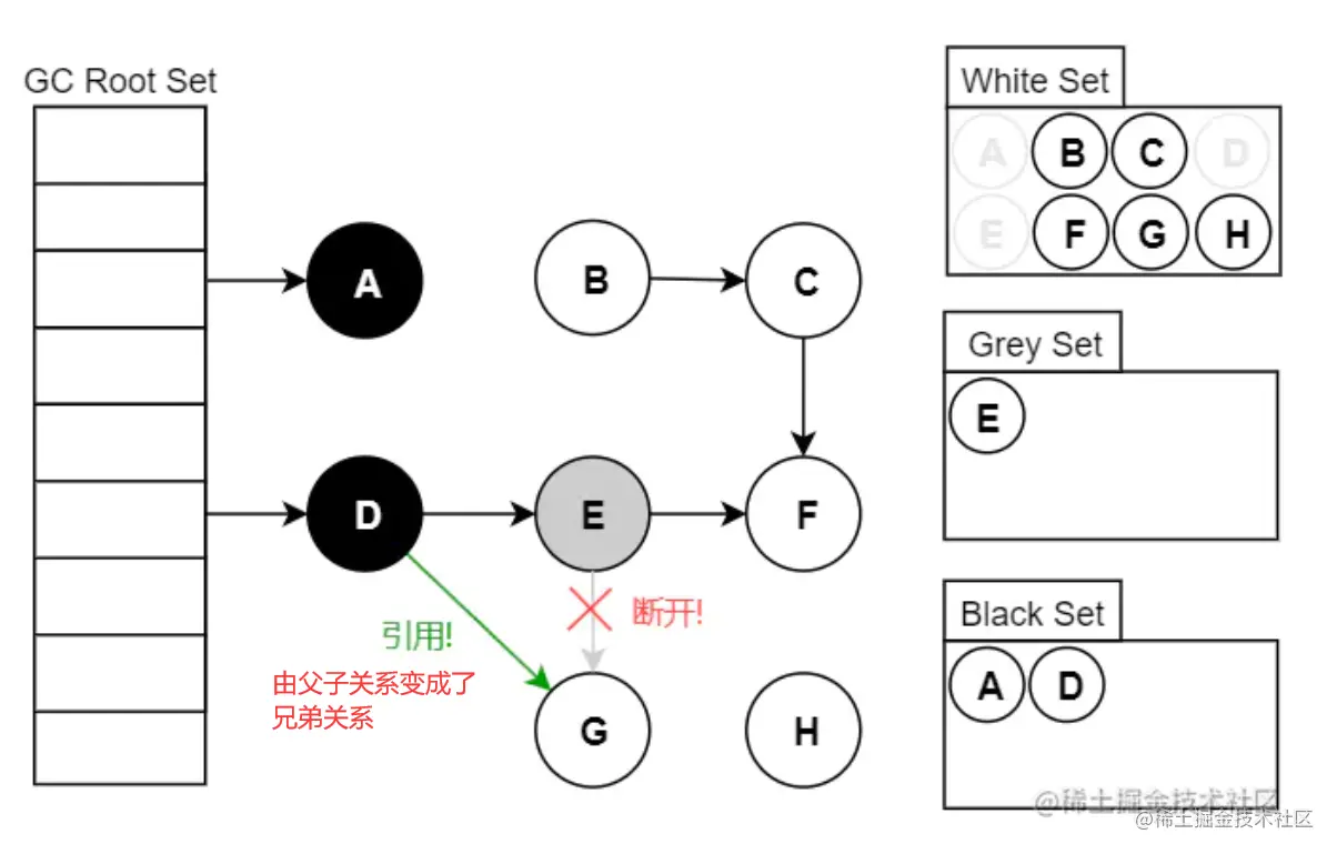 原来:D->E->G;但是现在:D->G,D->E。E 已经没有对 G 的引用了,所以不会将 G 放到灰色集合;尽管因为 D 重新引用了 G,但因为 D 已经是黑色了,不会再重新做遍历处理。