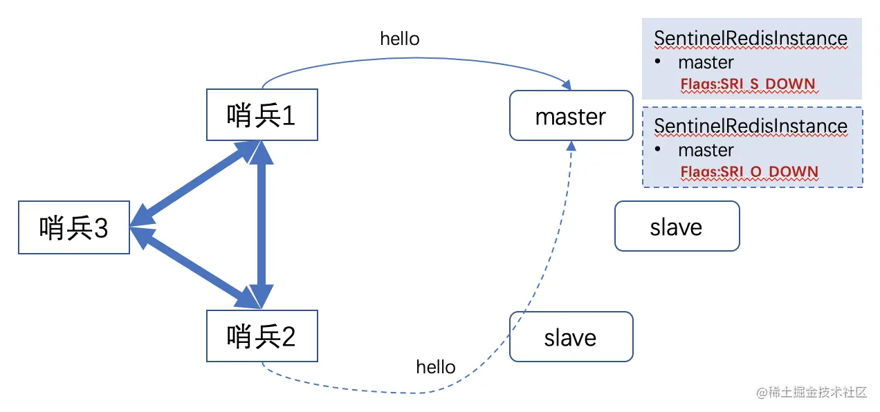 直到主节点故障,哨兵报出 sdown,同时此哨兵还会向其他哨兵发布消息说这个主节点挂了。发送的指令是 sentinel is-master-down-by-address-port。
