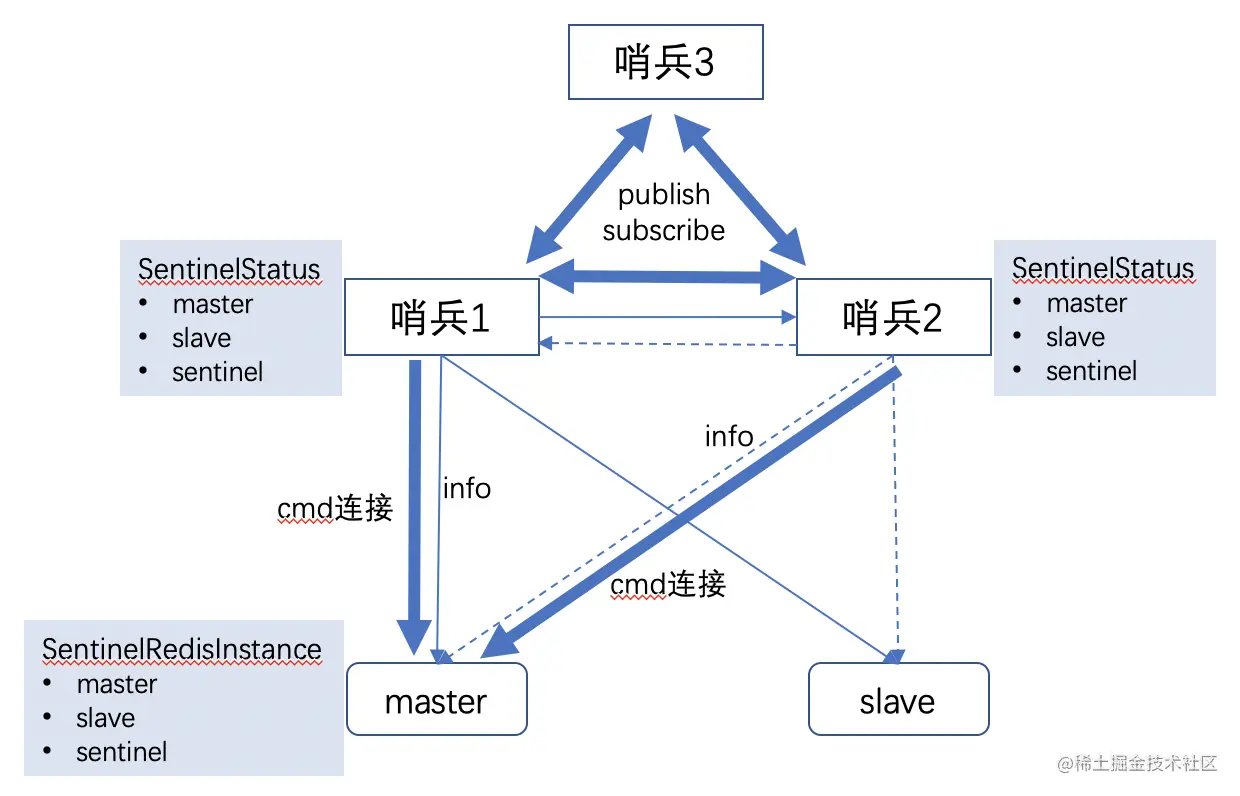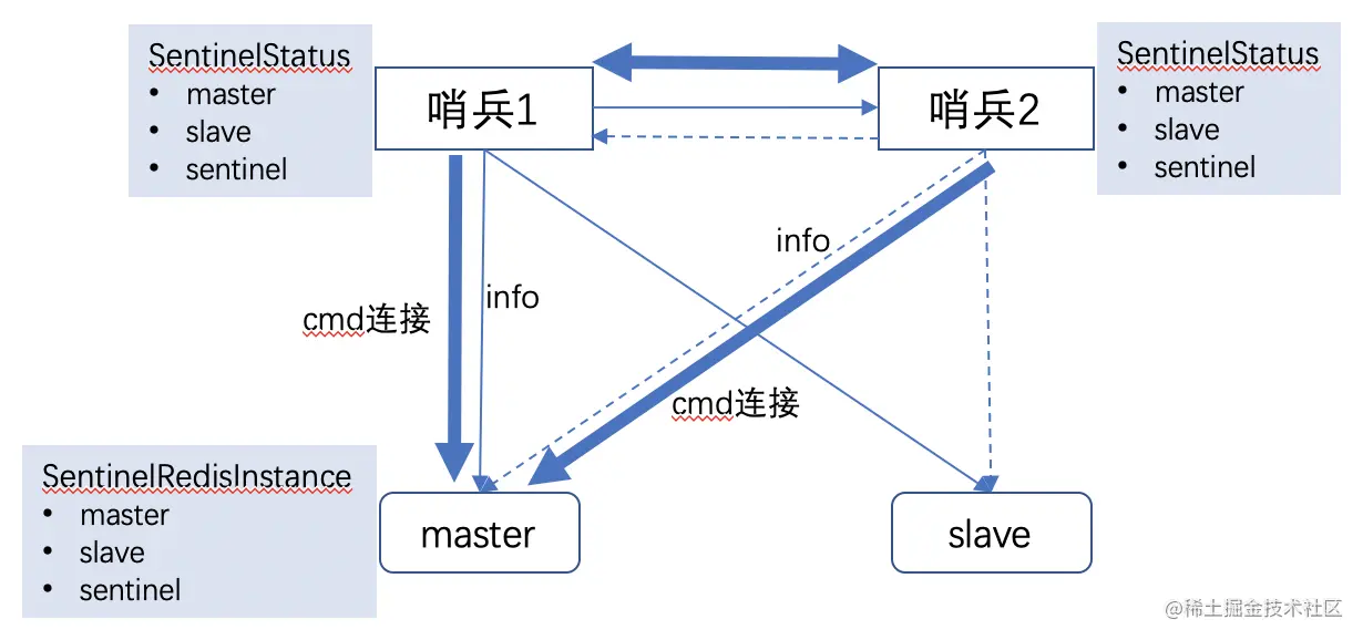 1)Sentinel节点会通过master/slave 节点建立的cmd连接获取其工作状态