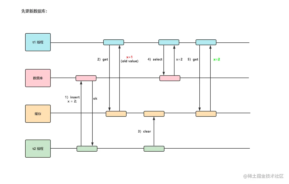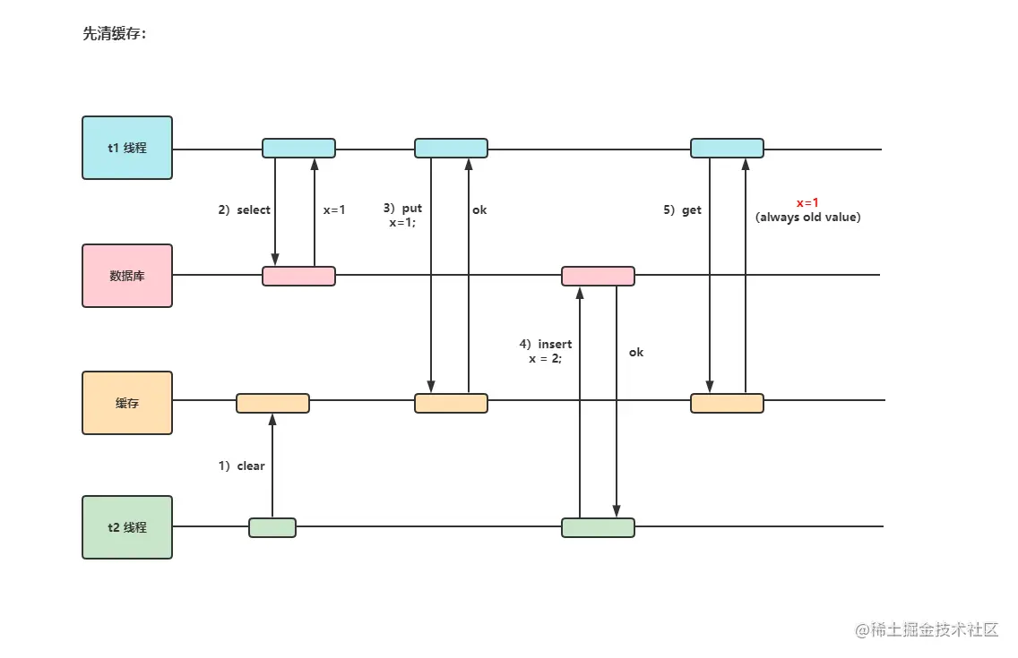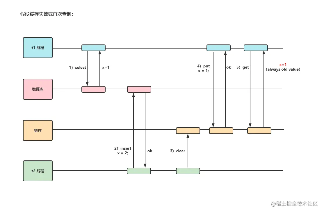 - 补充一种情况(这种情况的出现几率非常小),假设查询线程 t1 查询数据时恰好缓存数据由于时间到期失效或是第一次查询:
