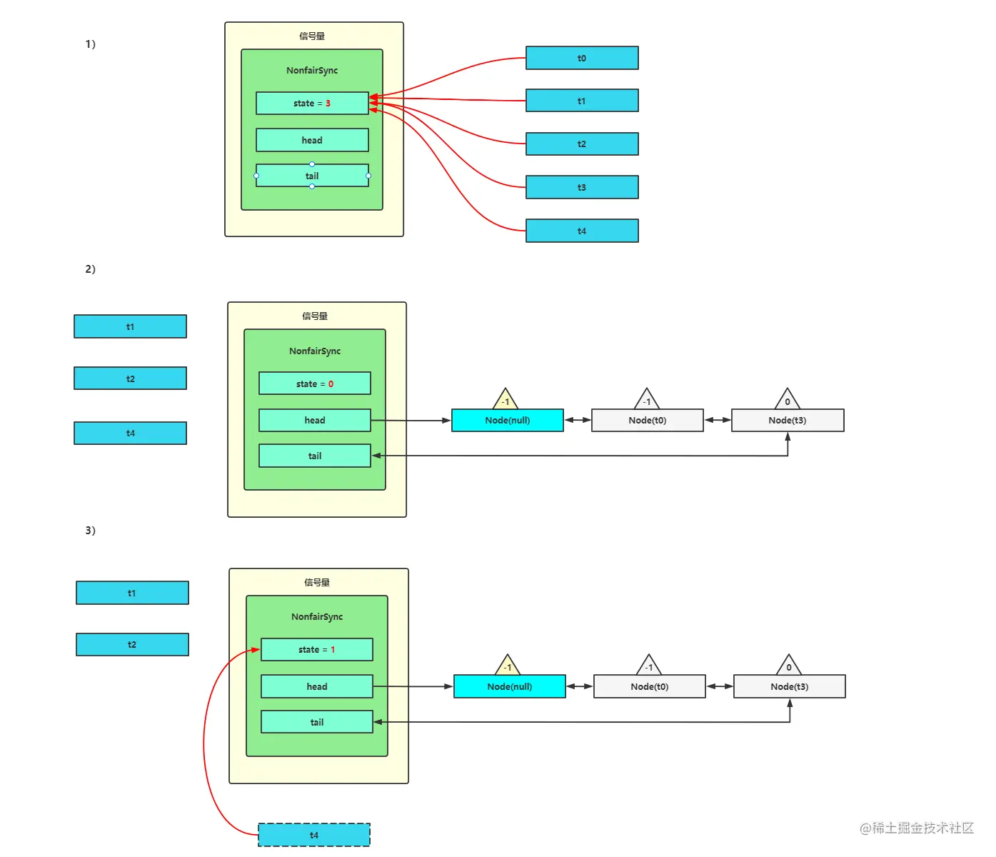 permits(state)为 3,这时 5 个线程来获取资源; - 假设其中 t1,t2,t4
