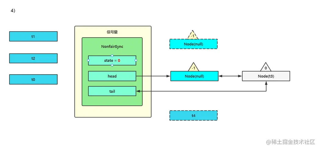 permits,接下来 t0 竞争成功,permits再次设置为 0,设置自己为head节点,断开原来的head节点,unpark接下来的 t3 节点,但由于permits是 0,因此 t3 在尝试不成功后再次进入park状态。