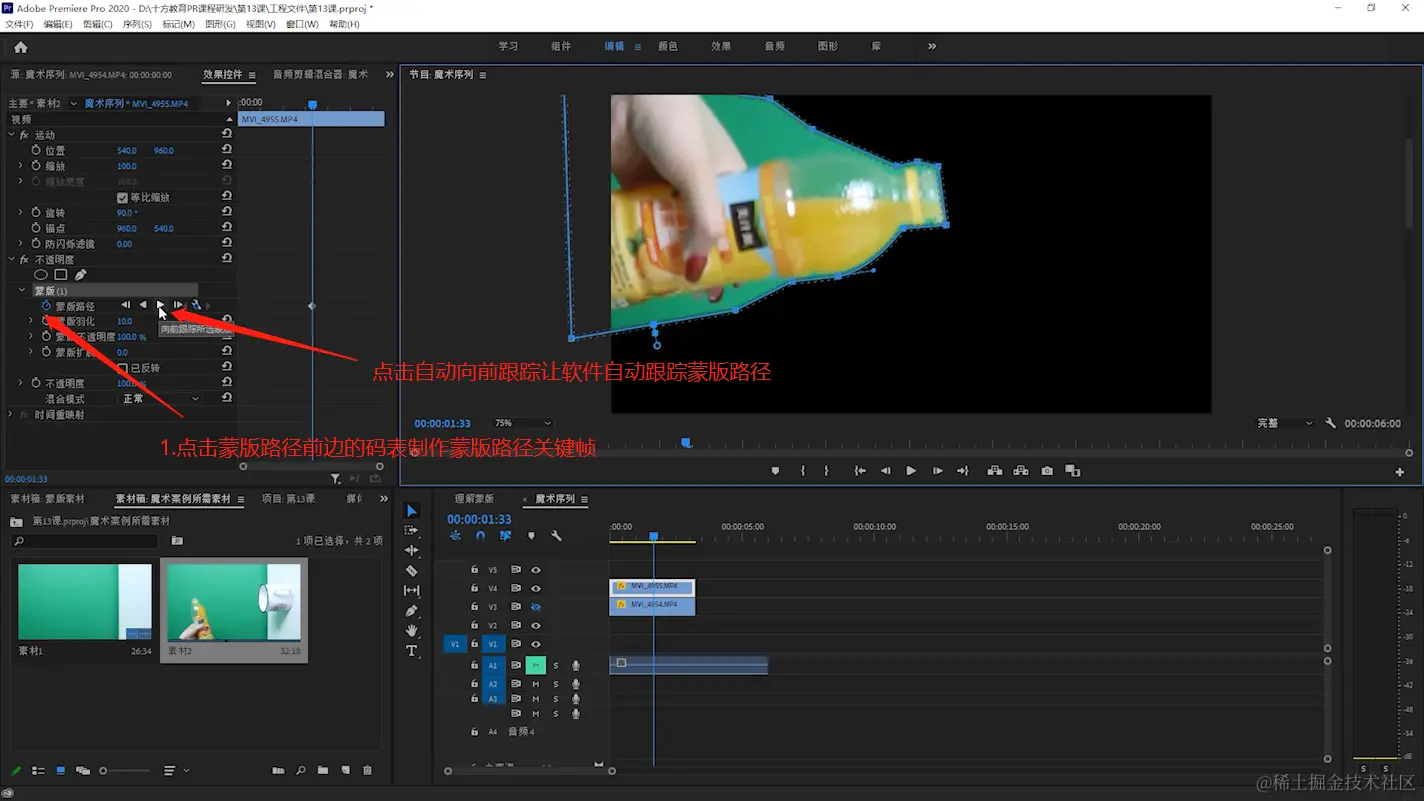 - 点击蒙版路径前边的码表制作蒙版路径关键帧,可以点击自动向前跟踪自动跟踪蒙版路径。(老师建议大家直接使用手动跟踪方式,拖动时间线一帧帧调整边角的边界,当然这两种方法都可以尝试一下)