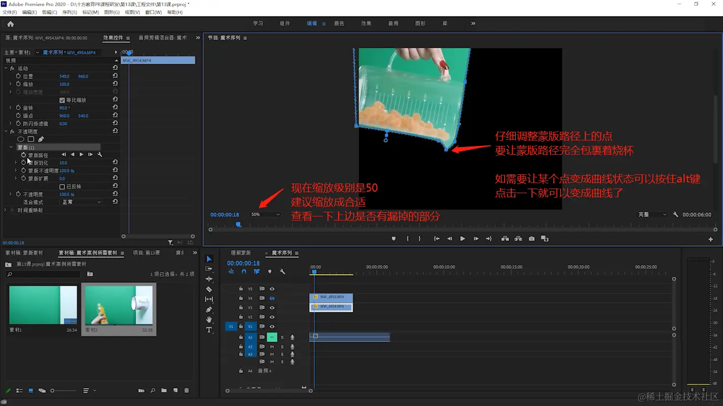 - 仔细调整蒙版路径上的点,要让蒙版路径完全包裹着烧杯的边缘。如需要让某个点变成曲线状态可以按住alt键点击一下就可以变成曲线了