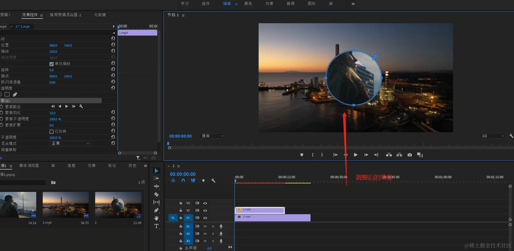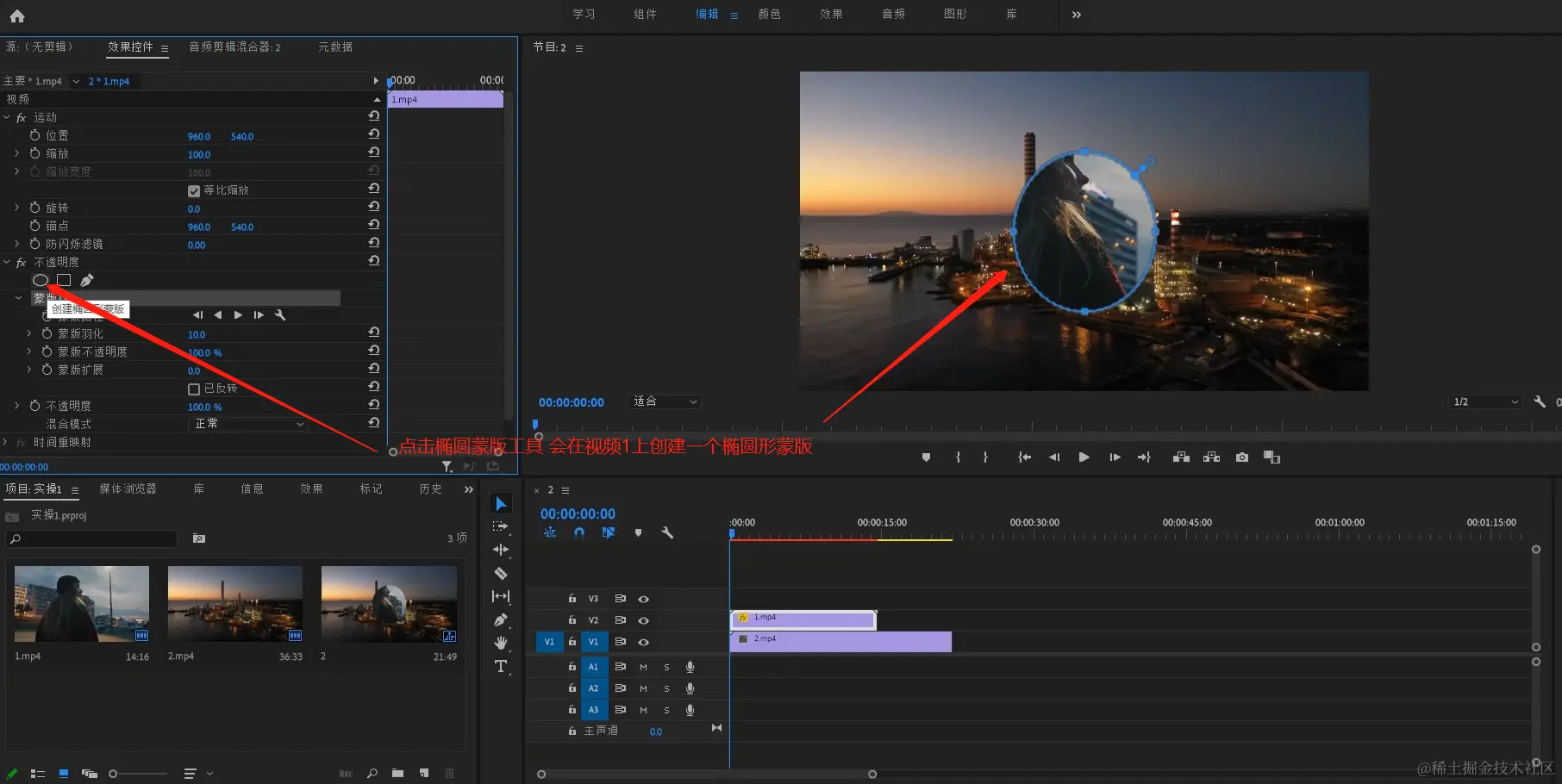 - 点击【效果控件】-【不透明度】椭圆形蒙版工具。