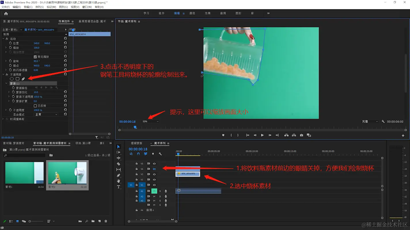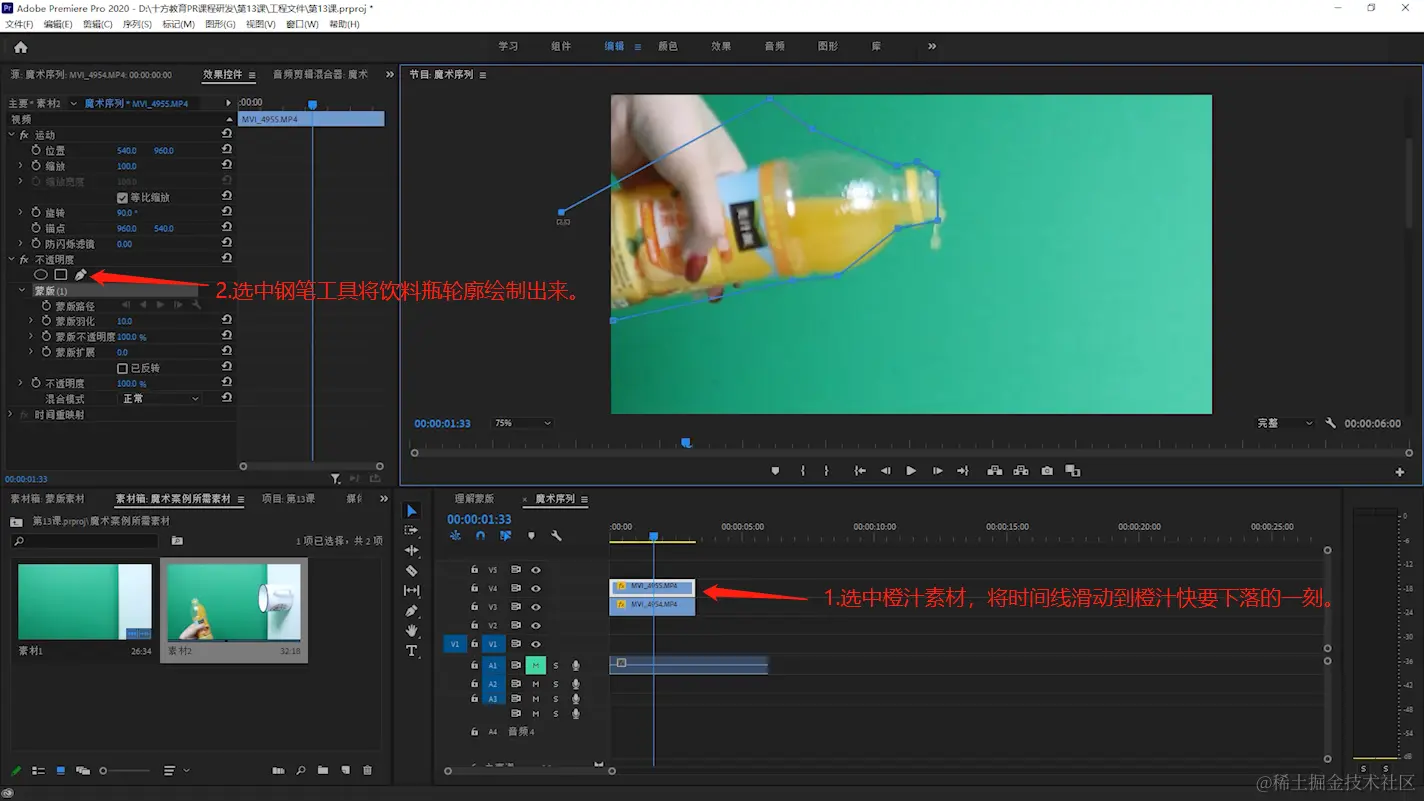 - 滑动时间线,一点点调整蒙版路径的位置始终要让蒙版路径在瓶子边缘位置,仔细调整。直到调整没有穿帮即可。