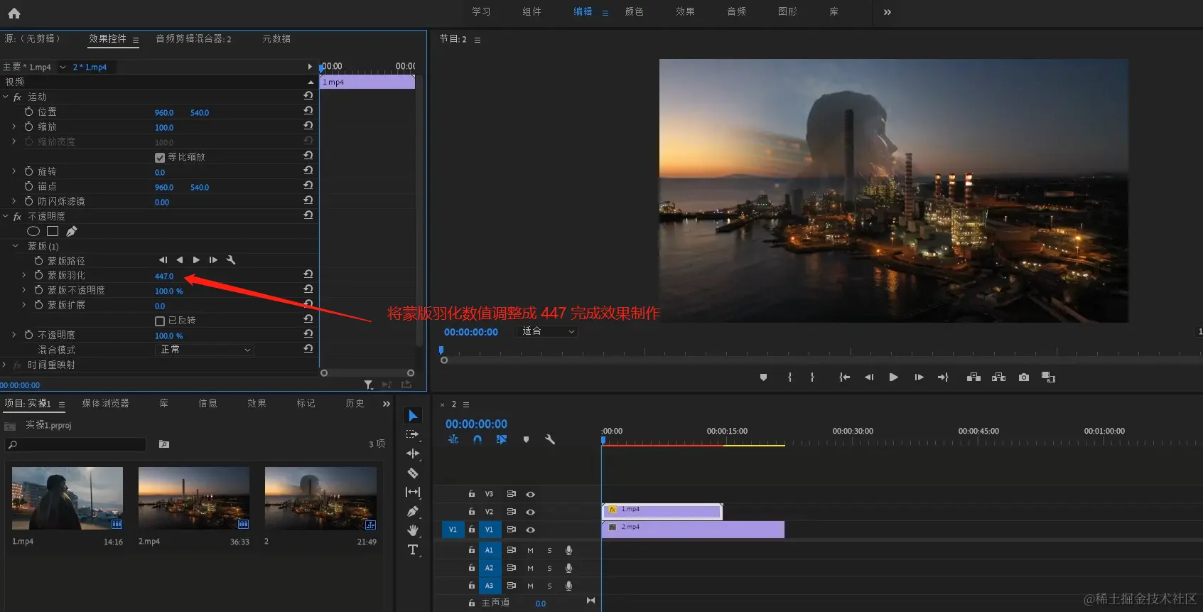 - 调整【不透明度】-【蒙版】-蒙版羽化。将数值调整成447完成效果制作。