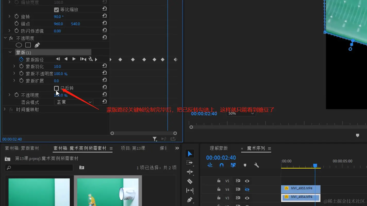 - 蒙版路径关键帧绘制完毕后,把已反转勾选上,这样就只能看到糖豆了