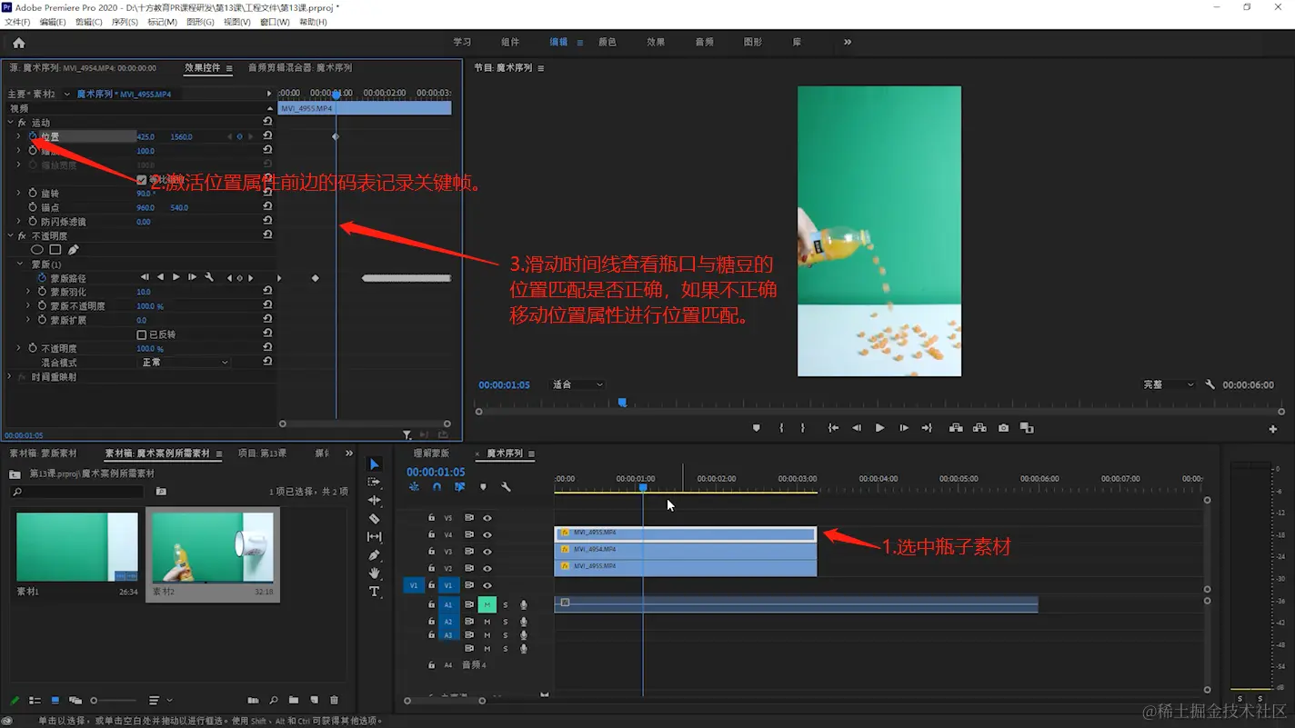1.选中瓶子素材,并激活位置属性前边的码表。滑动时间线查看瓶口与糖豆的位置是否匹配正确,如果不正确,移动位置属性,直到瓶口所有位置都能和糖豆匹配上即可。操作完这一步整个案例就制作完毕了。