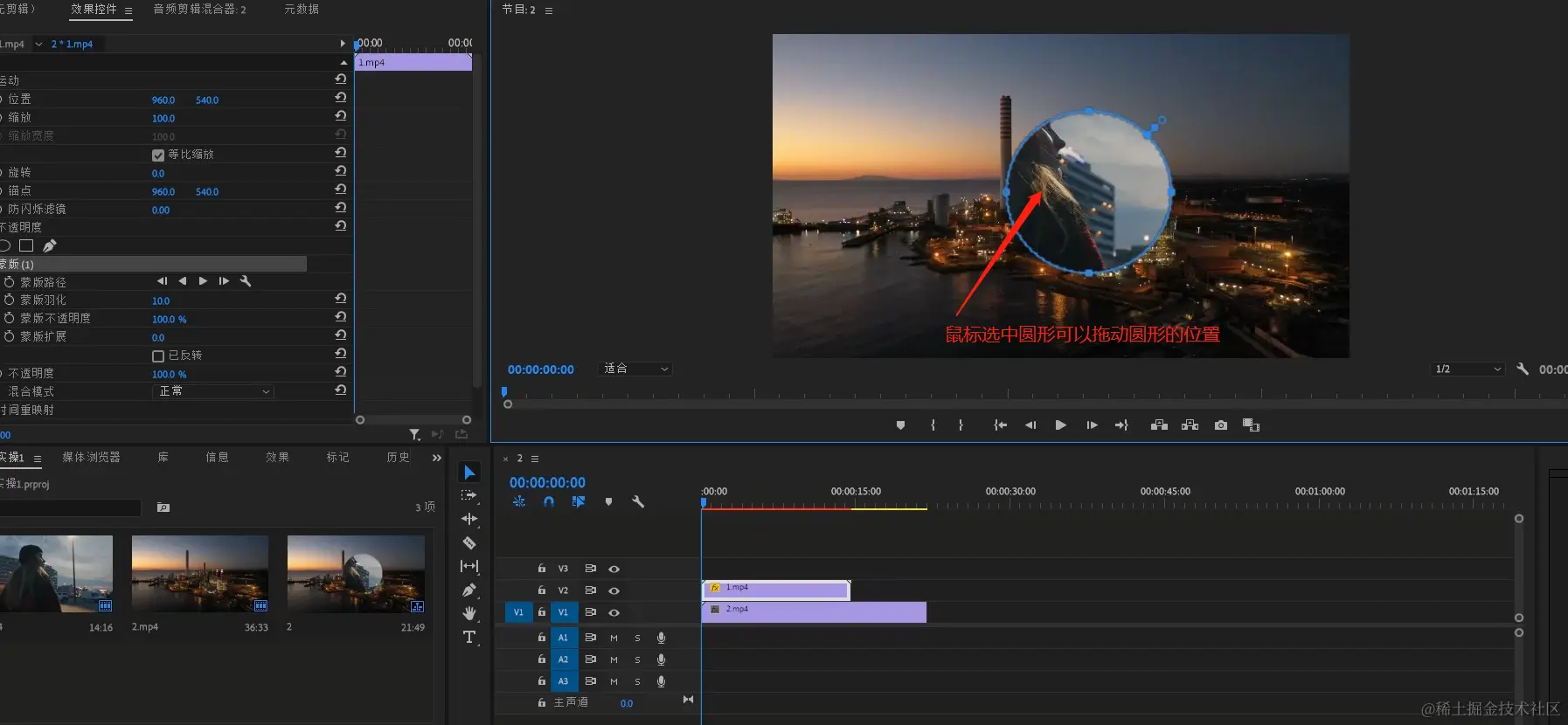 - 鼠标放在圆形内鼠标会变成抓手工具,这时按住左键不松手,可以拖动圆形蒙版的位置。