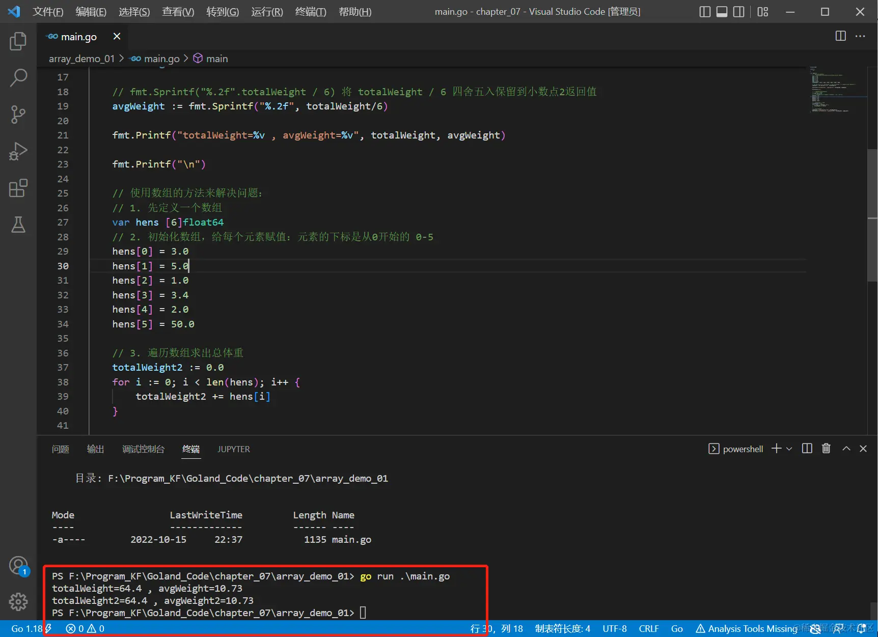 数组可以存放多个同一类型数据。数组也是一种数据类型,在Go中,数组是值类型。