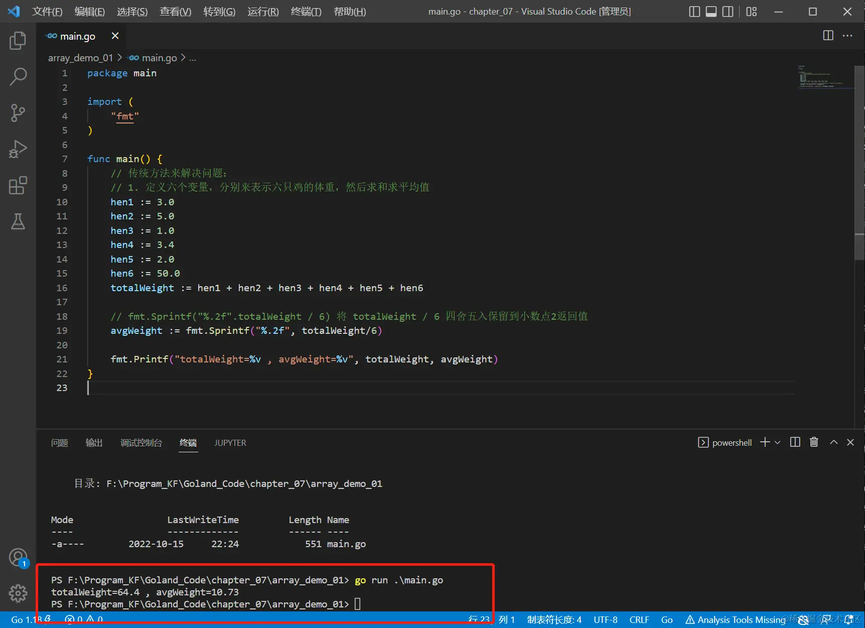 fmt.Printf("totalWeight=%v , avgWeight=%v", totalWeight, avgWeight)
