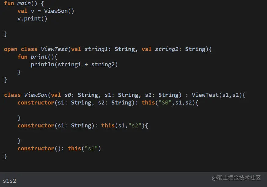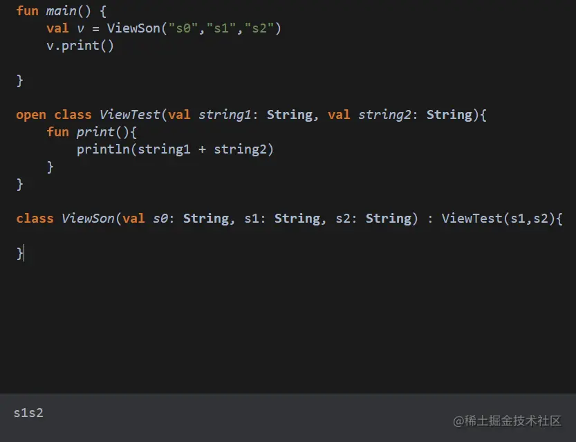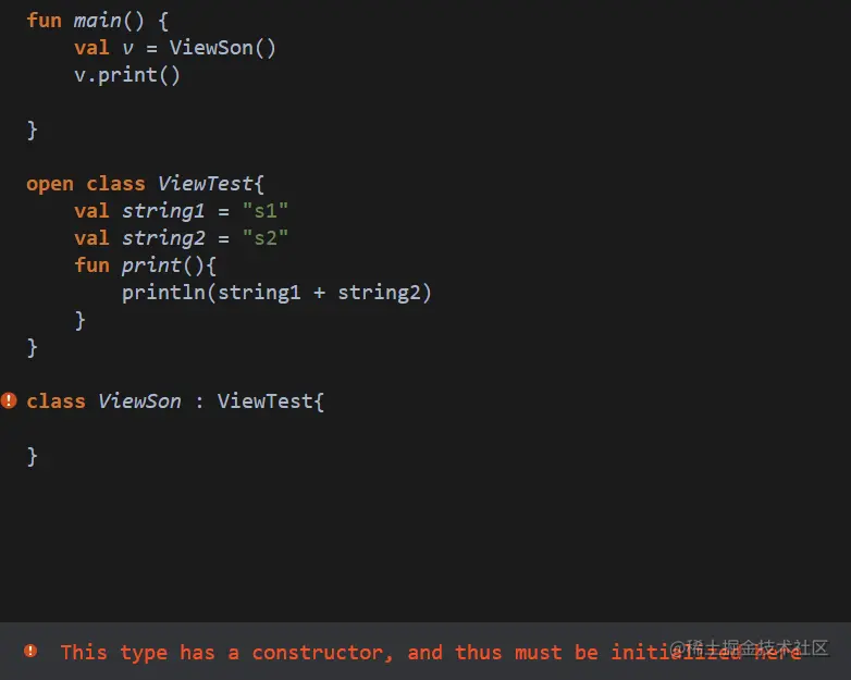 在上面子类的代码中,我们只是使用冒号:继承了 ViewTest() 这个类,却并未声明我们的类需要初始化父类的主构造函数是怎么样的。至于为何一定要声明,那是因为父类的主构造器参数可以是多样性的,不做声明就无法确定调用的父类主构造函数是怎么样的,不知道它有几个参数。所以我们直接在 ViewTest 后加上(),声明我们调用的父类的构造器是默认的,未改造的,就不会出错了。