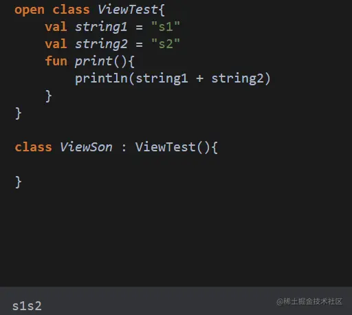 这样子, ViewTest 类就可以被继承了。说明一下,Kotlin 中继承使用的关键字是**:**。其次,我们创建一个子类继承这个 ViewTest 父类。然后运行这段代码。