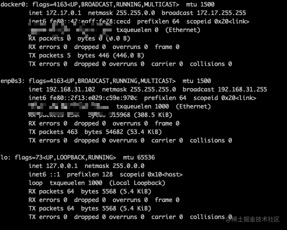 该机器真正的网口是enp0s3。 docker 启动的虚拟网口是docker0
