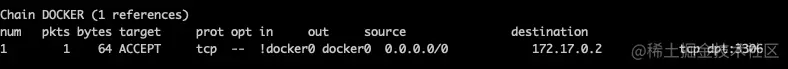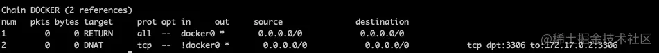 !docker0,表示非docker网络,该规则能被匹配。由于mysql 实际安装在docker内,如果最终要实现访问,就要对请求包的目标地址进行修改,于是该条规则在匹配后的动作是:tcp dpt:3306 to:172.17.0.2:3306,即将目标网络端口改成docker网段下的172.17.0.2:3306