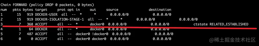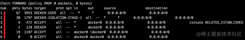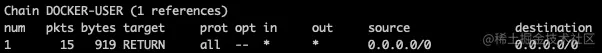 forward链中的第一条规则,会应用于DOCKER-USER链。该链的规则是直接返回包。