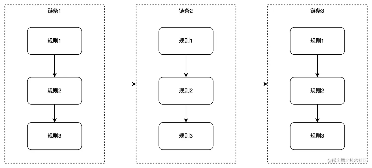甚至,我们可能还有多个互斥的规则,这多个规则,哪个规则先执行? 这就涉及到链这个概念。简单来讲,链就是将多个规则从上大小串起来的一个集合单位。规则按从上倒下依次进行匹配。