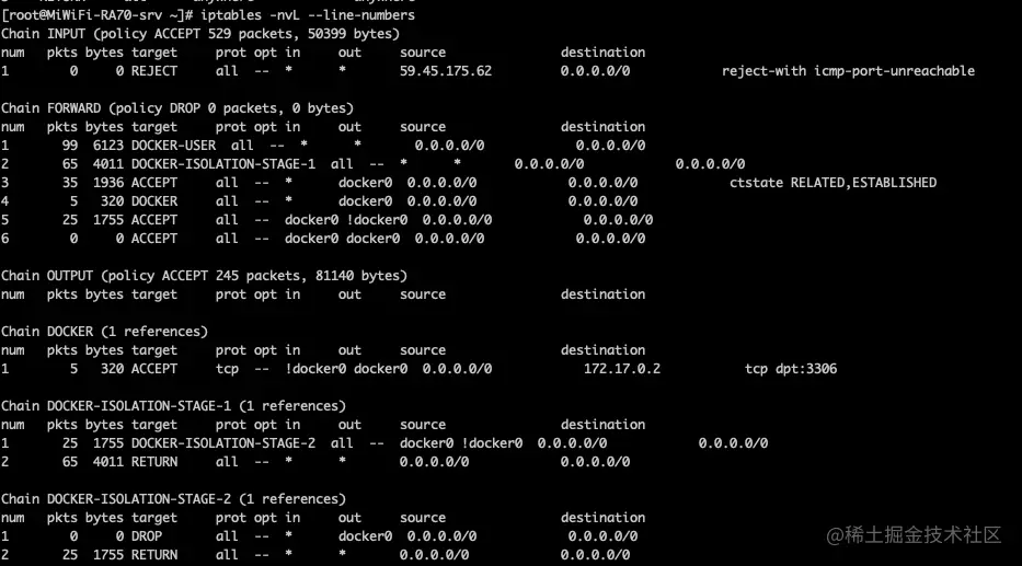 一般我们会在filter中的input链中,配置对某个端口的限制。但是在装有docker的linux服务器上,docker暴露的任何端口,我们却无法通过在filter表中的input链的规则进行限制,这是为什么呢? 我们通过上文的对整个iptables的工作机制,来拆解下原因。