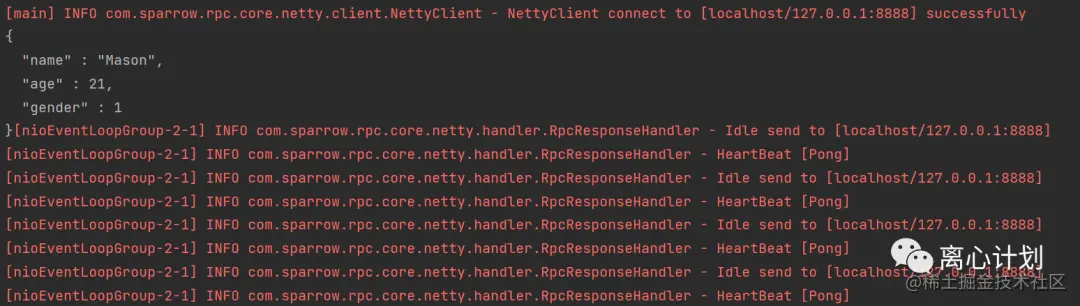至此,我们完成了Sparrow-Rpc所有的环节,现在我们编写测试类来测试一下我们一步步完成的RPC服务。我们创建一个UserService服务,并实现一个getUserByName方法,在client远程调用这个方法,完整的代码在sparrow-rpc-client和sparrow-rpc-server两个模块下,启动com.sparrow.rpc.server.Server和com.sparrow.rpc.client.Client 就可以看到效果了,通过控制台的信息可以看到通过传入的“Mason”服务端返回了具体的用户信息给我们,另外还有健康检测的打印信息来服务保活。