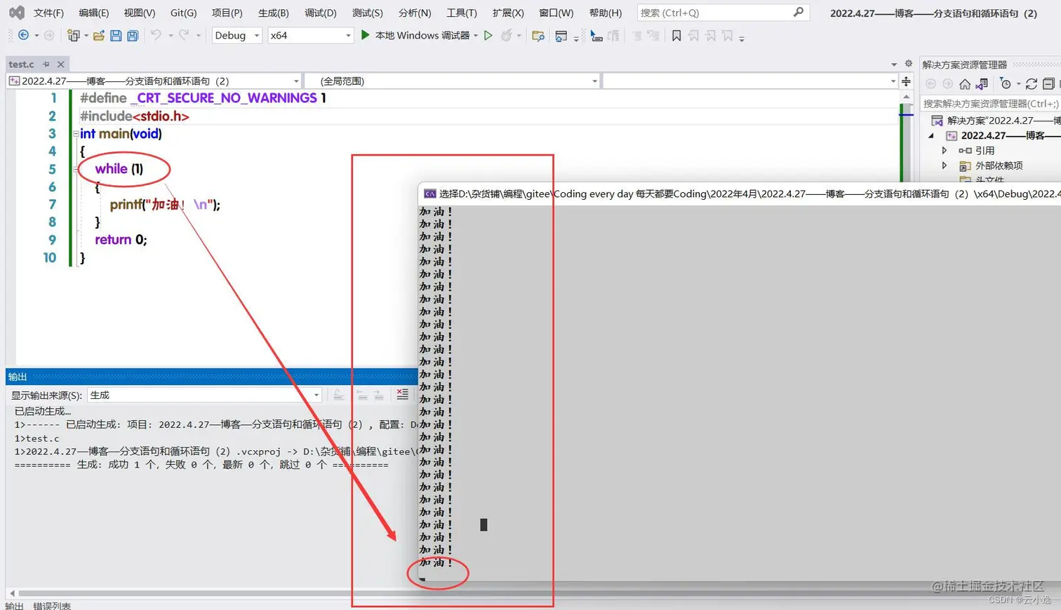 分支与循环(1)已经讲完了条件判断语句的if和while,接下来我们讲一讲剩下的两个语句:==循环执行语句和转向语句==。 —————————————————————————————— 首先先写上几句话:献给坚持创作的我和点开这篇文章希望进步的你