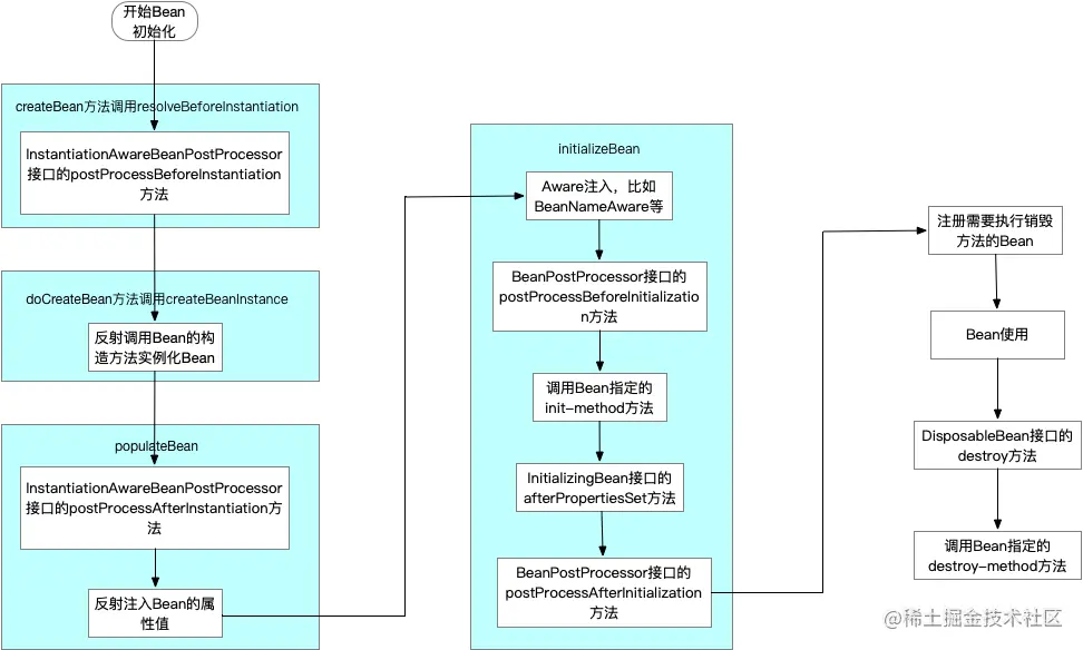 可以看到在每个Bean填充属性(populateBean)之后,调用init-method之前,会执行Aware接口,BeanPostProcessor的postProcessBeforeInitialization方法和InitializingBean的afterPropertiesSet方法,并且优先级顺序依次是Aware接口、BeanPostProcessor和InitializingBean。**BeanPostProcessor的postProcessAfterInitialization方法会在每个Bean调用init-method之后执行。**所以我们大致可以得到下面这个Bean生命周期图: