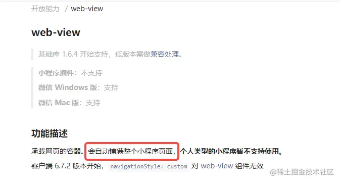 即小程序的WebView必须是全屏的,无法设置大小,这与上面分析的需求不符。理论上也许可以使用<cover-view>等方案局部覆盖实现,但效果显然好不到哪里去。所以WebView方案在小程序端行不通,需要另外实现一套小程序的渲染逻辑。