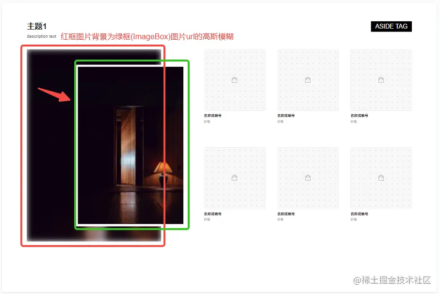 上图中绿框为一个图片组件ImageBox, 红框为一个普通的div,其backgroundImage属性值即为绿框图片src,并进行高斯模糊。