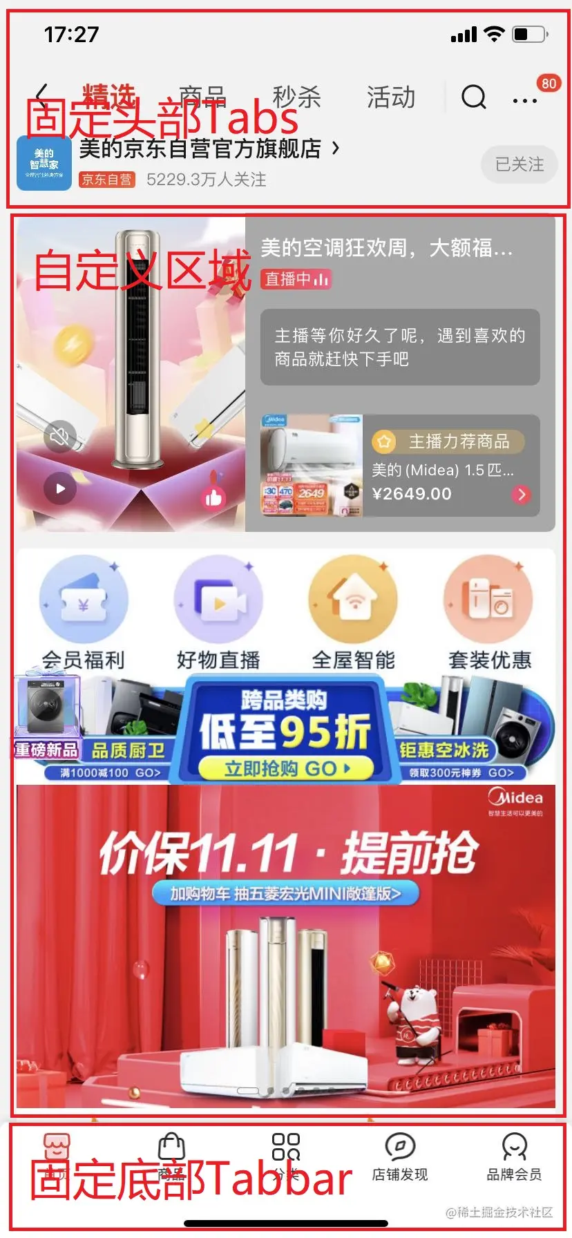 既然已支持响应式,那么不难想到,其他非浏览器端的平台,最简单的方式是使用WebView,直接嵌入H5的页面。通常的店铺主页,除了自定义的部分,还会有一些固定不变的组成部分,如头部Banner,底部Tabbar等,以美的旗舰店的京东主页为例: