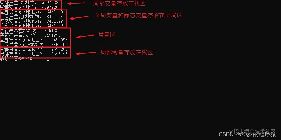 - 全局区:存放全局变量和静态变量以及常量