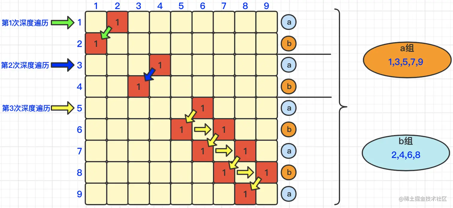 我们遍历第3行,由于发现与4发生了排斥,那么深度遍历到第4行,发现没有其他数组与4发生排斥,所以我们得出结论,即:3在a组,4在b组。