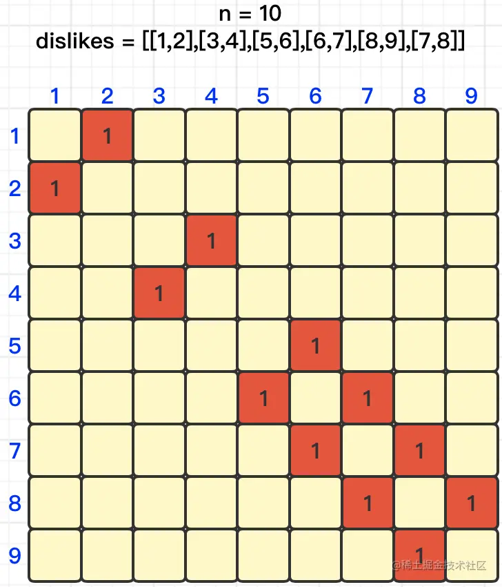 首先,创建一个二维数组,用来记录1到n个数之间的互斥关系。我们以n = 10,dislikes = [[1,2],[3,4],[5,6],[6,7],[8,9],[7,8]]为例,那么我们就可以得出如下矩阵图,如下图所示: