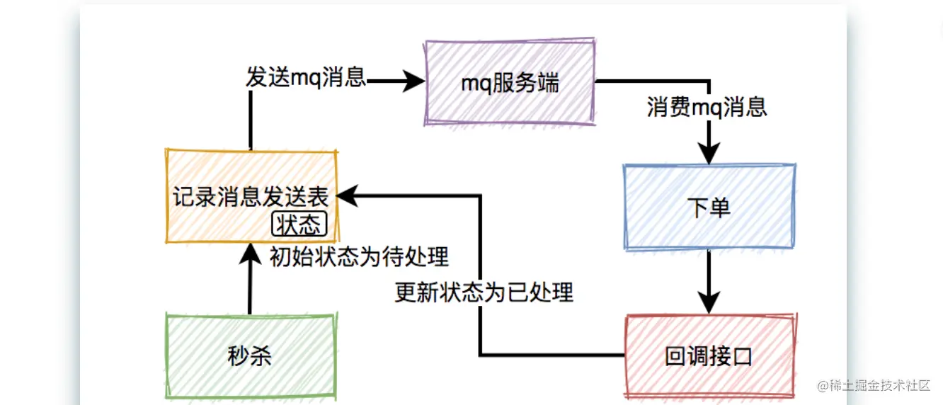 在生产者发送mq消息之前,先把该条消息写入消息发送表,初始状态是待处理,然后再发送mq消息。消费者消费消息时,处理完业务逻辑之后,再回调生产者的一个接口,修改消息状态为已处理。
