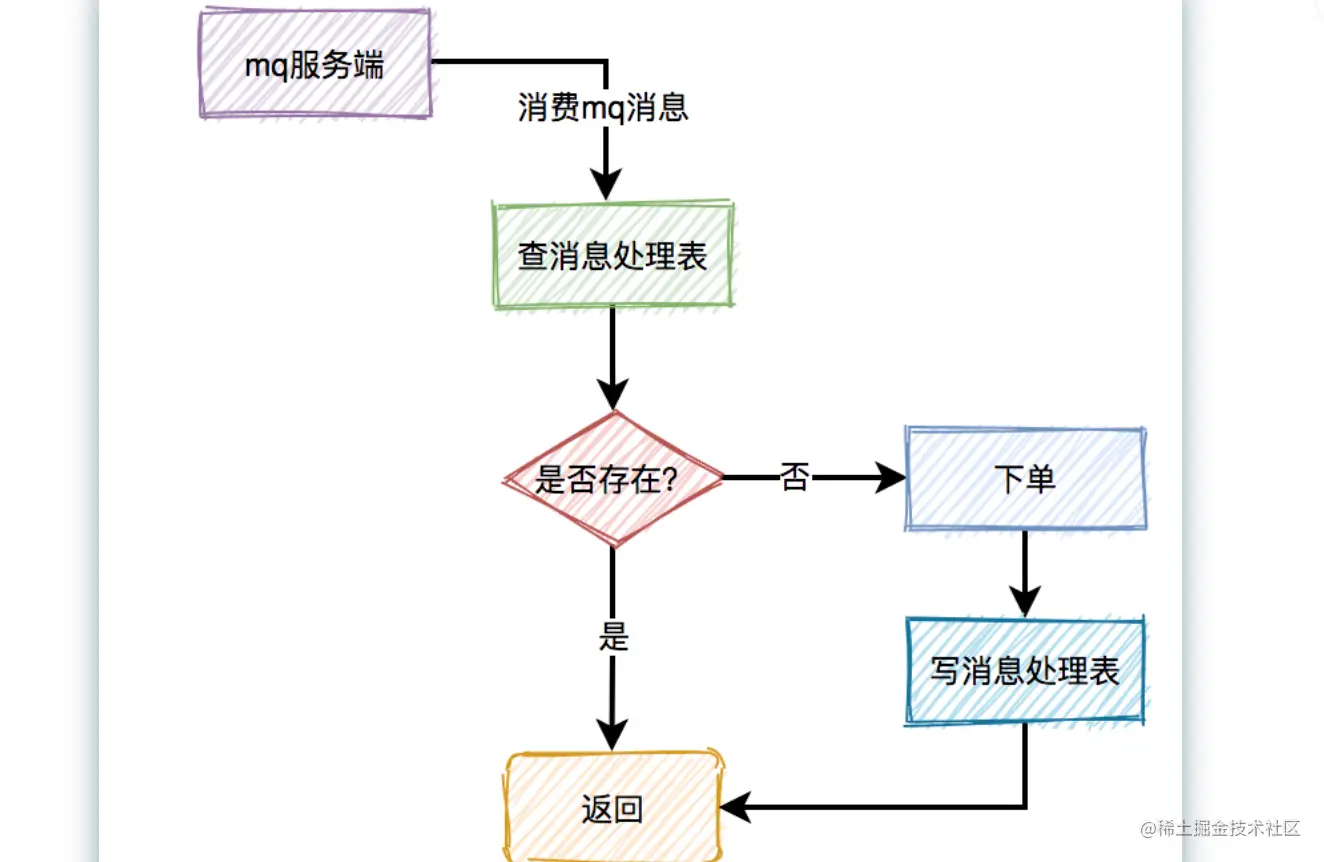 如果不存在,则进行下单操作,接着将该消息写入消息处理表中,再返回。