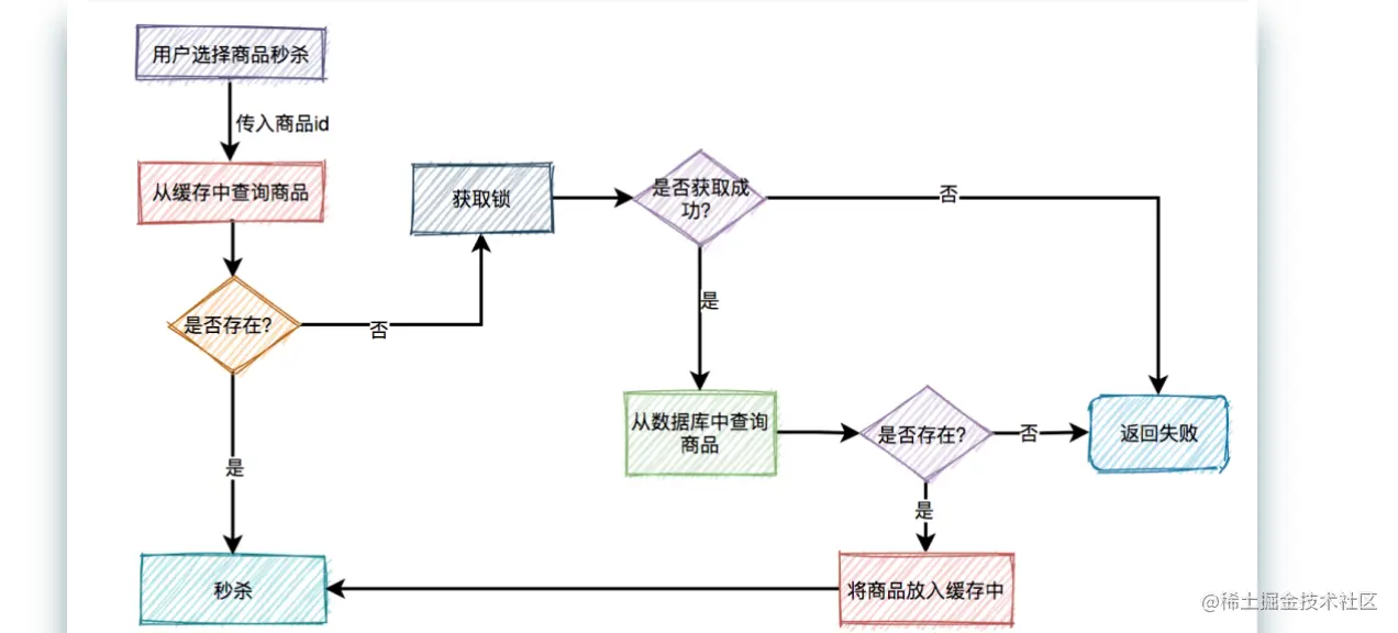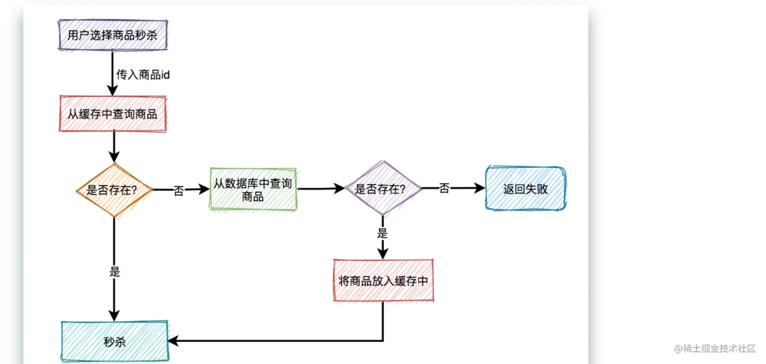 如果不存在,则需要从数据库中查询商品,如果存在,则将商品信息放入缓存,然后参与秒杀。如果商品不存在,则直接提示失败。